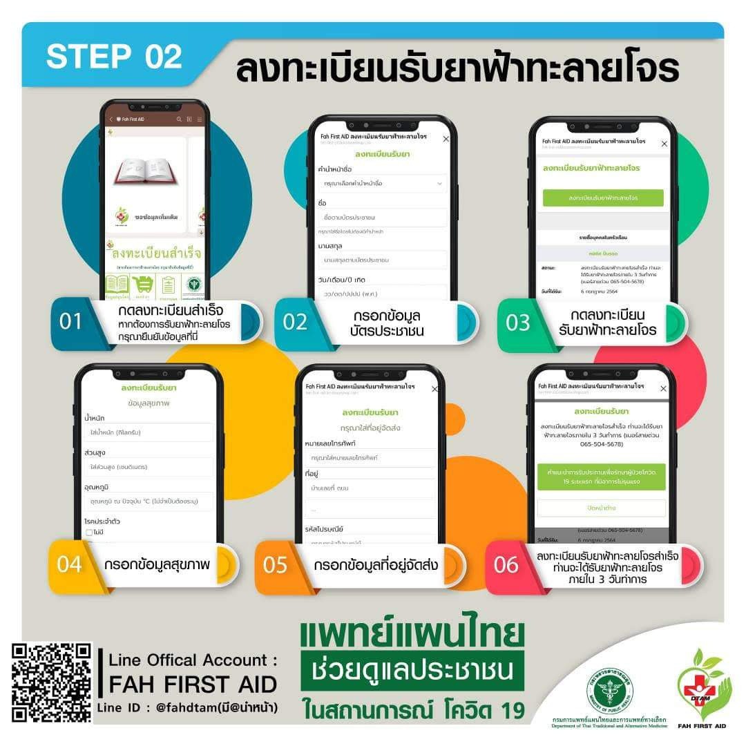 ทางด้าน ดร.ภญ.มณฑกา ธีรชัยสกุล ผู้อำนวยการกองสมุนไพรเพื่อเศรษฐกิจ กล่าวว่า สำหรับขั้นตอนการรับบริการ LINE OA : FAH FIRST AID ท่านสามารถลงทะเบียน โดยการ เพิ่มเพื่อนผ่านไลน์ “FAH FIRST AIDแล้วจากนั้นให้ท่านทำการกดลงทะเบียน แล้วกดยอมรับ ยินยอม และรับทราบตามลำดับ ระบบก็จะให้กรอกข้อมูลส่วนตัว และกดบันทึกปรากฏหน้าจอยืนยัน กรณีลงทะเบียนสำเร็จจะมีข้อความแจ้งยืนยันการลงทะเบียนสำเร็จ สำหรับ LINE OA : FAH FIRST AID จะมีบุคลากรที่มีความรู้ความเชี่ยวชาญคอยตอบคำถามเกี่ยวกับข้อมูลฟ้าทะลายโจรทั้งหมด ที่ประชาชนสอบถามเข้ามาทุกคำถาม เพื่อให้ประชาชนได้รับทราบข้อมูลฟ้าทะลายโจรที่ถูกต้อง