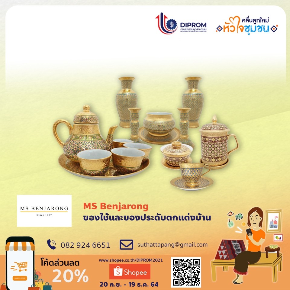 นางสาวสุทัตตา สุรินทร์รัฐ เจ้าของผลิตภัณฑ์ Ms benjarong สินค้าที่ร่วมจำหน่ายในแคมเปญเป็นเครื่องเบญจรงค์ลายน้ำทอง เป็นงานเขียนมือที่นำเอาน้ำทองมาเขียนบนเซรามิก ส่วนใหญ่จะทำเป็นของใช้ ของตกแต่ง เช่น ชุดน้ำชา แก้วน้ำ จาน ชาม โคมไฟ เน้นใช้งานได้จริง และแบรนด์ของเราจะเน้นความละเอียดในการสร้างสรรค์ชิ้นงานแต่ละชิ้น ด้วยงานฝีมือคนไทยที่ประสบการณ์กว่า 30 ปี ผลจากการเข้าร่วมแคมเปญ “ตลาดสินค้าคลื่นลูกใหม่หัวใจชุมชน” โดย DIPROM ร่วมกับ SHOPEE แม้ว่าในส่วนของยอดขาย จะไม่เพิ่มขึ้นไม่แตกต่างจากก่อนเข้าร่วมแคมเปญมากนักเนื่องจากยังอยู่ในช่วงแรก แต่เมื่อมีการนำสินค้าไปไลฟ์ผ่านอินฟลูเอนเซอร์ทำให้มีคนรู้จักเพิ่มขึ้นและเข้ามาติดตามร้านเพิ่มมากขึ้น